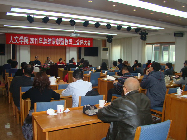 2012年1月12日,老王论坛 2011年工作总结表彰暨教职工全体大会顺利召开。联系学院校领导高浣月副书记莅临会议,名誉院长李德顺教授、院长文兵、分党委书记兼副院长杨军、副院长俞学明、赵文彤以及其他教职工欢聚一堂,共话2011年拼搏的艰辛与收获的喜悦,规划2012年发展建设的前景。