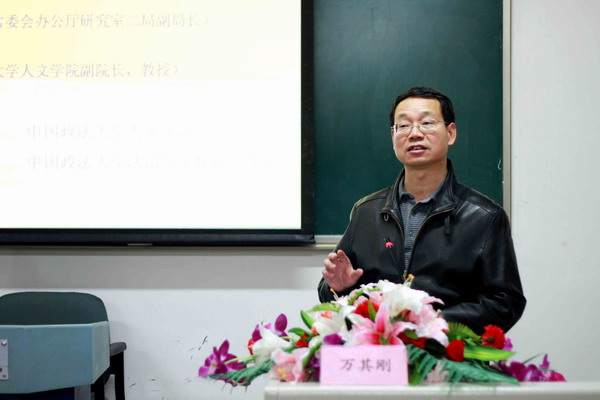 万其刚先生首先以“人权”概念的研究及法律发展为例,阐明对于某些法律理念的研究不应局限于法律层面,而应结合哲学、伦理学等多视角、多层面进行。在此基础上,万教授又将“以人为本”概念与我国古代的“民本”及现代的“人民”概念做了区分,分析了“以人为本”概念的进步意义。此后,万先生围绕其多年的研究成果,结合一些现实案例,围绕民生的几大方面,如宪法的修改、义务教育法的修改阐述了中国立法如何正在进行“以人为本”的改革。万先生重点介绍以人为本原则贯彻到立法层面的几点努力:“在实践中扩大人民民主及其实现形式”、“注重公权力与私权利的区分”、“立法的民主化与科学化”以及“公众参与立法”。万先生的报告使在座同学对中国立法现状及其努力、立法如何在现实基础上实现以人为本具有更为深入的了解。