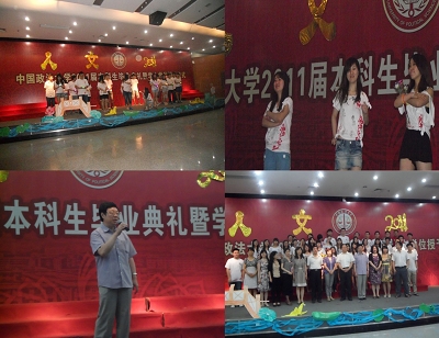 晚会以一段精心制作的视频拉开帷幕,视频中既追忆了过去四年的点点滴滴,又展望了未来的前程似锦。特别的是,其中不仅有中文系、哲学系老师们对毕业生的祝福,更有远在新疆的尹晓华老师寄来的音频,她无法送别07级同学的遗憾以及即使相隔万里也无法隔断的对同学们的四年祝福之情都让所有毕业生都忍不住掉泪。