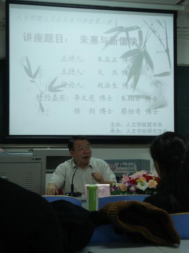 12月10日晚7时,应老王论坛 哲学系邀请,朱熹第二十六代孙,台湾著名学者、社会活动家朱高正先生做客法大,在学院路校区教学楼208教室为我校研究生作了一场以“朱熹与新儒学”为题的学术讲座。此次讲座由老王论坛 院长文兵教授主持,中国社会科学院赵法生博士作点评人,国务院参事室综合业务司副司长李文亮博士、中国关心下一代工作委员会中华传统文化诵读工程秘书长蔡恒奇博士、清华大学经济学院教授徐剑博士、国际儒学联合会普及委员会委员朱翔非博士等作为特约嘉宾与我校部分教师出席了本次论坛。