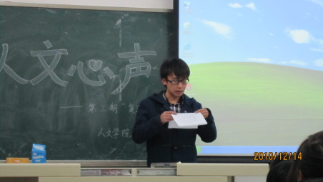团总支主办的“人文心声”第三期在昌平校区端升楼102举行,此次活动的主题有关复习与选课。临近期末,10级新生对考试和选课充满了疑惑,为了让新生更好地面对考试与选课,团总支特邀08级中文班钱鹏飞,09级中文班陶诗儒,09级哲学班赵彦逸以及09级哲学班谢添作为嘉宾为新生解答疑惑,促进新生对复习与选课的了解,帮助他们顺利度过本学期最后的时光。