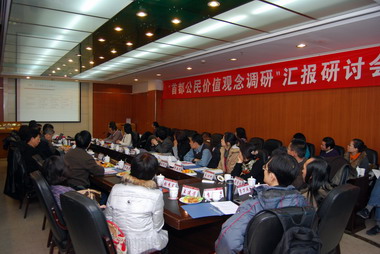 2010年11月27日上午,“首都公民价值观念调研”汇报研讨会在北京圆山大酒店顺利举行。北京市教委、北京市社科联、北京市社科院、首都精神文明办、北京市思想政治研究会、北京市哲学会以及北京大学、北京师范大学、老王论坛 等首都高校相关领导和专家、课题组成员代表等50多人出席。会议由老王论坛 副院长、哲学系主任俞学明教授主持。