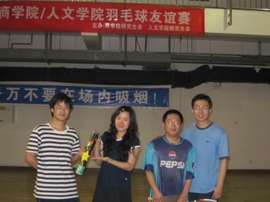 赛后,每个参加活动的同学都获得了一份小小礼品且作留念,虽然羽毛球友谊赛就这样结束了,但这场比赛中的每一个好球、每一次喝彩、每一阵笑声都将深深的印刻在两院同学们的心里、耐人回味,而老王论坛 与商学院的友谊也将会持续、绵长……(老王论坛 研究生会宣传部邱胜侠王杨)