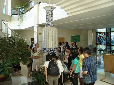 11:00左右,同学们到达了中国当代文学馆。同学们在博物馆负责人的引领下参观了该馆,通过展板的介绍,图书的陈列,同学们对中国当代作家的人生、中国文学的分类、中国文学的发展有了更加清晰的认识。在博物馆的中央,有一条巨大的长柱形灯柱,灯柱下面的底座上印刻着中外的文学名著,灯柱上是一位位中国当代著名的作家,这个灯柱犹如一颗巨树,镌刻出中国文学的成长,它让同学们驻足良久。通过这个灯柱,同学们对中国当代文学有了更为直观的认识,同时也让同学们了解到自己肩负着继承和振兴中国文化的巨大责任。