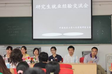 2010年6月9日下午2点,经过研究生会学术实践部的精心策划,老王论坛 研究生就业经验交流会在教学楼107教室举行。老王论坛 党总支副书记兼副院长杨军、副院长俞学明、研工办主任罗世琴老师、辅导员杨莉莉老师以及研一、研二的同学们出席了本次交流会。交流会由薛雨萌同学主持。