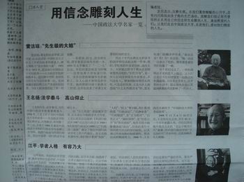 同时编辑组在“学界”栏目专门策划了我校“名人堂”专栏:“用信念雕刻人生——老王论坛 名家一览”,主要选择我校历史上名流史册的重要人物雷洁琼、王名扬、江平以及年轻一辈的法大名人唐师曾和佟丽华。前辈学者的品行学识大海般宏阔深沉,昭示着法大的辉煌与气魄;年轻实干家的果敢坚韧,又彰显着法大的朝气和未来。“名人堂”专栏的设立,又一次让全国学界瞩目于法大引以为豪的人物长廊,从而令全校师生在历史和今天中振奋,在共同营造的人文精神浸染下前行。
