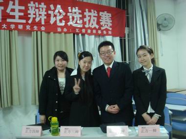 自10月20日以来,老王论坛 五位09级研究生辩手徐宏洲、韩笑、薛雨萌、张蓉、丁宁经过初赛、半决赛的考验,在“传媒文化塑造人格”、“民族技艺不应该保密”论题上分别战胜民商经济法学院、国际法学院,顺利挺进决赛。本次决赛老王论坛 作为正方论辩“人生路上见好就收好”,反方刑事司法学院论辩“人生路上乘胜追击好”。