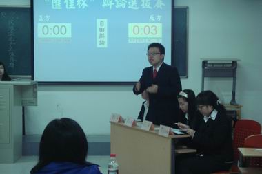 2009年11月5日晚七点,我校首届研究生“汇佳杯”新生辩论选拔赛的决赛在教学楼419室举行。本次辩论赛由校团委主办,研究生会承办,汇佳律师事务所协办。民商经济法学院党委书记兼副院长王光进教授、马克思主义学院副院长孙美堂教授、国际法学院国际公法研究所所长李居迁教授等出席并担任评委。