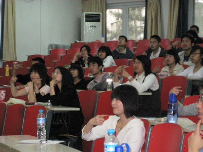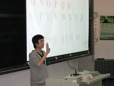 晚六点,讲座准时开始,来自“心灵之语”的志愿者首先向我们讲述了中国聋哑残障人的现状以及对其的认识,并对同学们进行了常用的手语培训,包括26个英文字母及日常用语的手语表示方法。志愿者讲得生动形象,同学们也都听得饶有兴趣,学得非常认真。在进行简单的常用手语培训后,为了使大家能够尽快记住这些手语,志愿者便带领大家进行了手语互动——手语猜词游戏,这个游戏主要就是一个同学用手语表演,另外一名同学猜第一位同学表演的是什么词语。同学们都踊跃参加,表演出奇,幽默不断,笑声连连,掌声热烈,气氛非常活跃。最后是一段手语欣赏,志愿者给同学们播放了由北京城市学院制作的视频“手语歌--只有爱”,其主题是“手语心连心,沟通无障碍”,大家深受感动。活动在热烈的掌声中圆满结束。