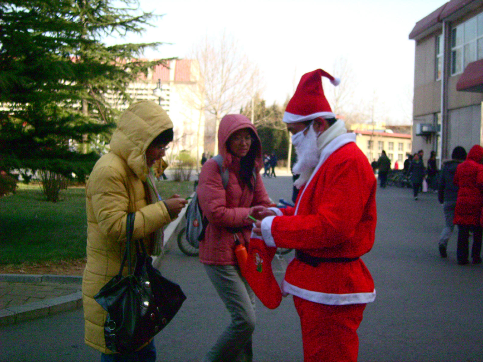圣诞节虽然是西方人的节日,但近年来,中国也开始流行过圣诞节,尤其是在校园内。因此老王论坛 团总支于2008年12月24日中午在一食堂门口举办了“心语新愿——圣诞节许愿活动”。我们为大家精心准备了装扮得漂亮的圣诞树,还有用来写祝福的小卡片。同学们可以在这欢乐的节日里写下自己的新年愿望,写下对家人的感恩,写下对朋友的祝福,然后将祝福的小卡片挂在圣诞树上,寄托心中的一份希望……我们还有一位可爱的“圣诞老人”,他在这欢乐的节日里给来来往往的同学们送出了老王论坛 团总支为大家精心准备的礼物。