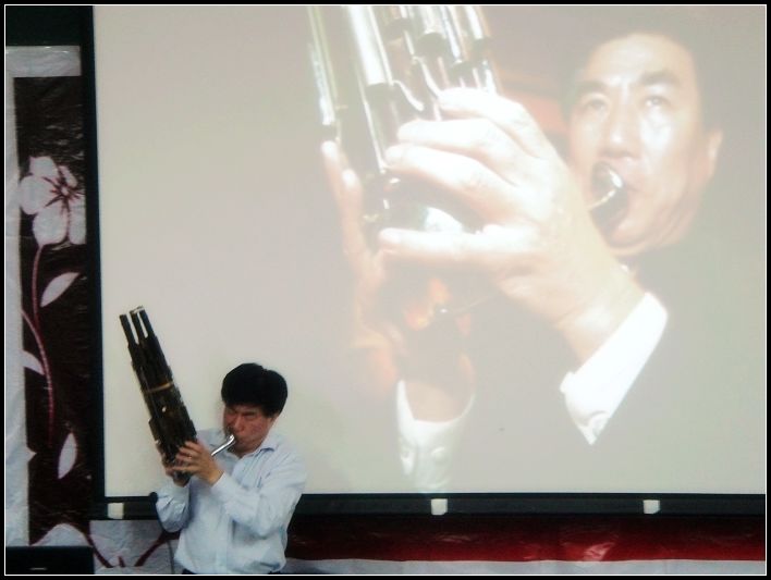 今晚,在老王论坛 学生会全体成员的共同努力下,本次“国乐大家高校行”系列活动拉开了帷幕,第一场讲座《此情只应天上有》获得了圆满成功。本次讲座由我国著名的著名笛箫演奏家罗守诚先生和笙演奏家翁镇发先生担任主讲,同时,出席讲座的还有老王论坛 党总支副书记兼副院长杨军老师。讲座在优雅的笙奏曲《茉莉花》的伴随下开始,首先由翁镇发老师(前上海东方广播民族乐团副团长,与牟善平先生合作研制的三十七簧加键笙,是一位世界级的民族器乐艺术家)为大家解读笙,他从笙的发展历史、种类区别、音色特点、构造及演奏技巧几个方面传授了此种乐器的丰富知识,并现场演奏了《瑶族舞曲》等多首经典曲目,台下观众掌声不断,真可谓“重门深锁无寻处,疑有碧桃午树花”!然后,罗守诚老师(他活跃于国内外舞台演出和教学活动,五次东渡日本教学和演出,受聘于日本华乐团等中乐团体任特约演奏家及上海音乐学院、南京师范大学等任特约教授)用边叙边演的方式深情、生动地让大家对笛、箫这两种乐器有了更加深刻的认识。讲座将至尾声时,罗教授说到:现实太丰富、太精彩因此也太难以预料,而艺术作品只有超越了生活的波澜起伏之后才会有真的意义。